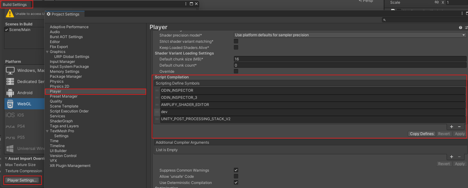 전처리기는 #define, #if #else #endif 문법을 이용하여 전처리 작업(코드 복사)을 하는데 사용하는 문법입니다.보편적으로 코드에 많이 삽입하는 방식으로 작성하지만, 개발 도구에서 프로젝트 속성과 같은 프로퍼티를 호출하여 입력하는 방식으로도 사용합니다.File → Build Settings...Player Settings...Player → Script Compilation+/- 기호를 눌러 필요한 전처리기 지시어를 추가 또는 삭제합니다.